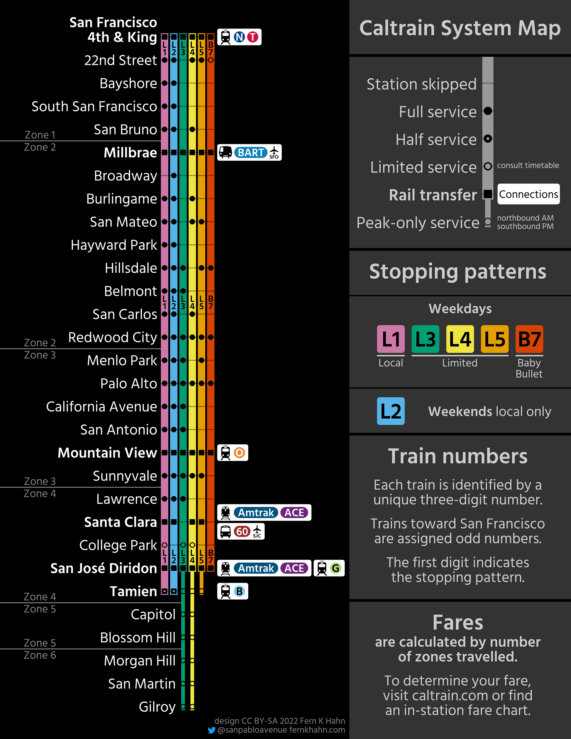 Caltrain is a regional railway connecting San Francisco to San José, operating six different service patterns on their singular line. Making sense of these — three of which are branded "Limited", one of which operates on weekends, and most of which include slight internal variations — requires sifting through timetables to find a train that stops at both of your endpoint stations. Their official map makes no effort to communicate these stopping patterns despite the simplicity of their system, instead expending information space on surrounding geography and odd depictions of onward connections. I saw an opportunity to fill in for Caltrain's lacking rider communications, and it wouldn't be my last time doing so.